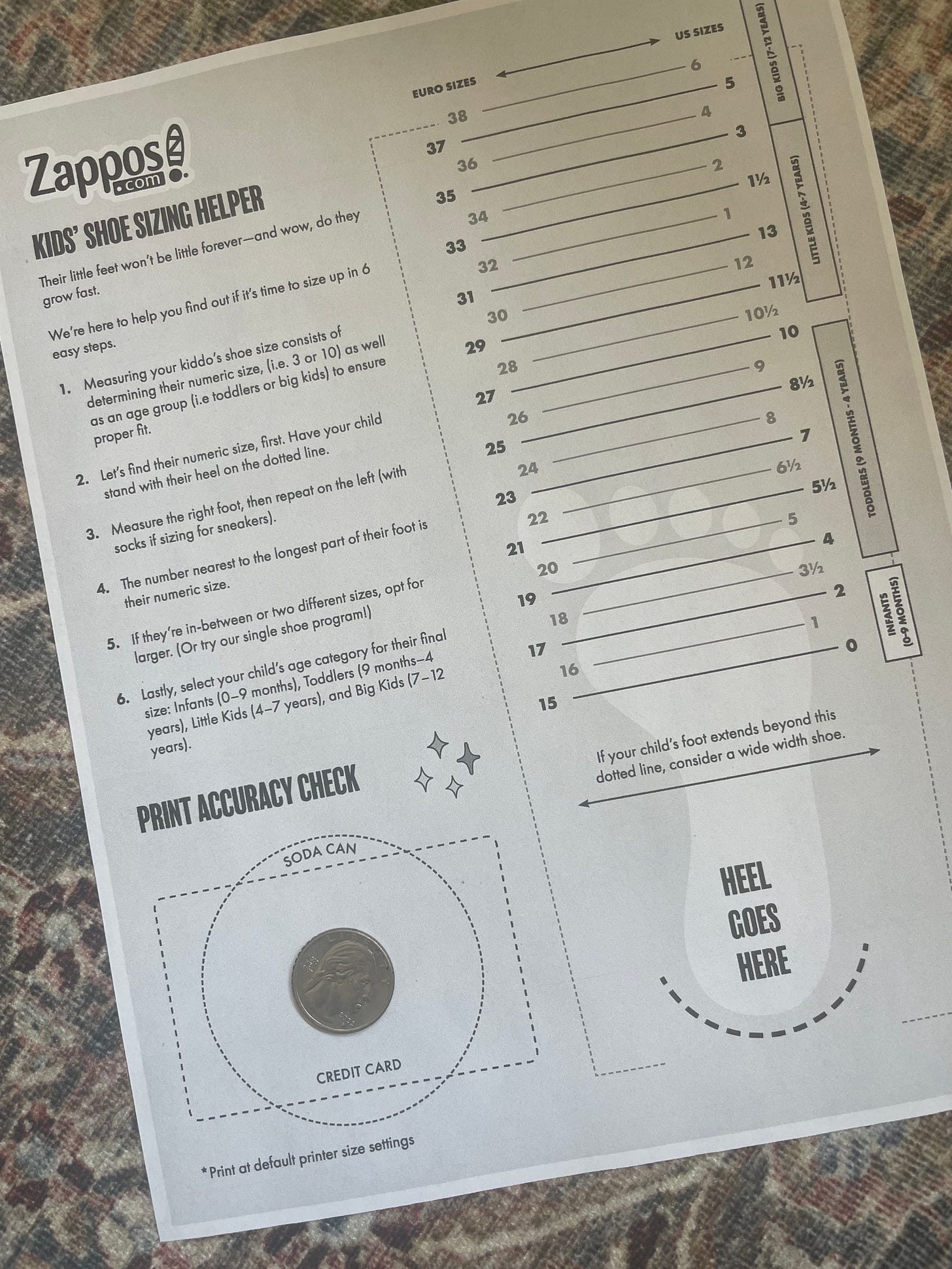 I’m sure it would be easier to go to a shoe store, but I just don’t want to. It’s a weekend errand with my kids that I don’t want to run. So I print out Zappos’s handy shoe size chart, measure their feet, and then order a few options (not necessarily from Zappos). Returns are still necessary, but I’ve found the sheet of paper has greatly reduced the number of re-orders needed.